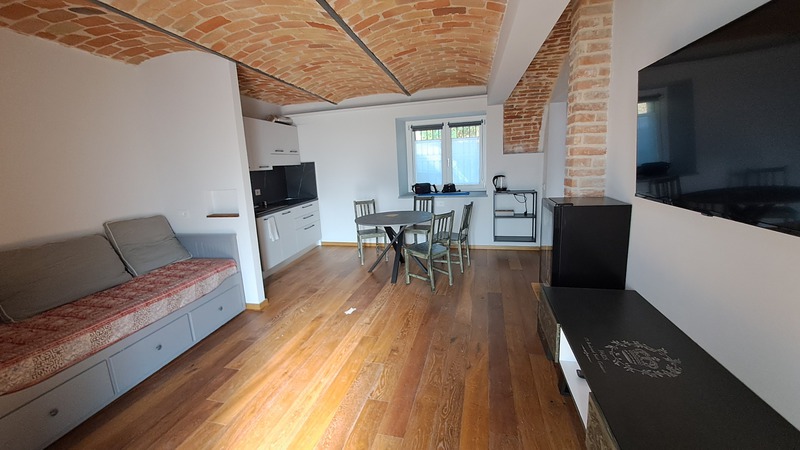 Questo bilocale al piano terra nasce da una ristrutturazione della vecchia stalla della cascina, attualmente in classe energetica A+++ è dotato di riscaldamento/raffreddamento a pavimento con climatizzatore deumidificatore, pavimento in parquet, un cortiletto esterno attrezzato, il wi-fi e la possibilità di usufruire della piscina dello stabile.